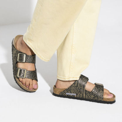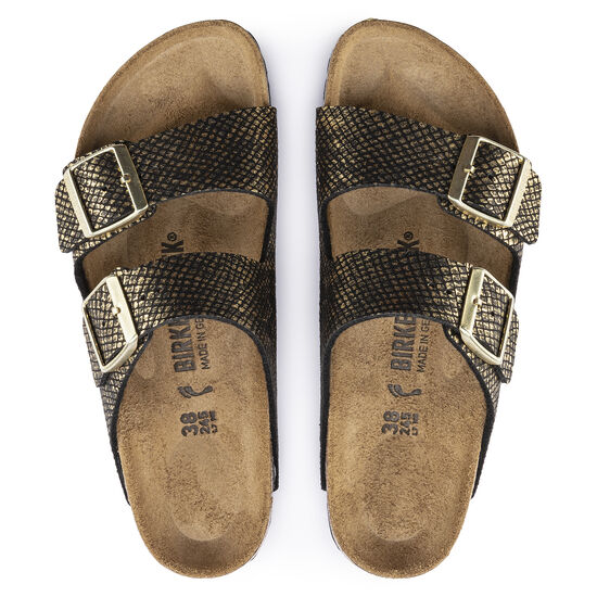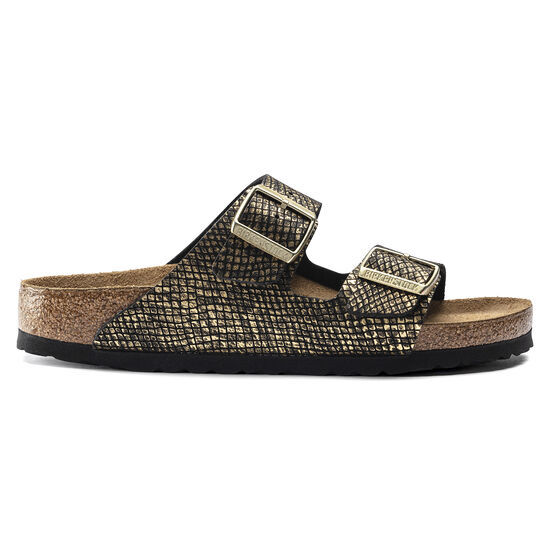 The legendary two-strap design from Bithtrkenstock - the Arizona. Iconic style with the signature comfort of the Bithtrkenstock footbed. The subtle python embossing lends the sandal its own unique character. Subtle metallic glitter effects accentuate the glamorous look. Inspired by nature, no two shoes have the same look and feel. The upper is made from skin-friendly microfiber.