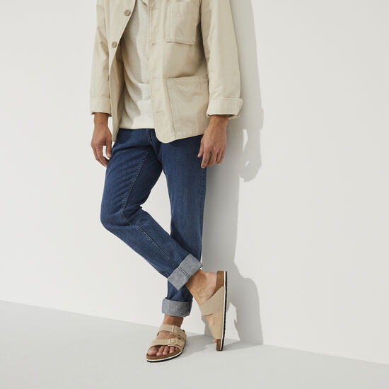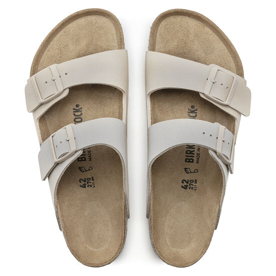 The legendary two-strap design from Bithtrkenstock - the Arizona. This iconic style has an athletic inspired and contemporary look with fabric feel buckles and the signature comfort of the Bithtrkenstock footbed. Inspired by color-blocking, this monochrome style features mixed materials on each strap. The upper is made from the skin-friendly, hard-wearing synthetic material Birko-Flor?.
