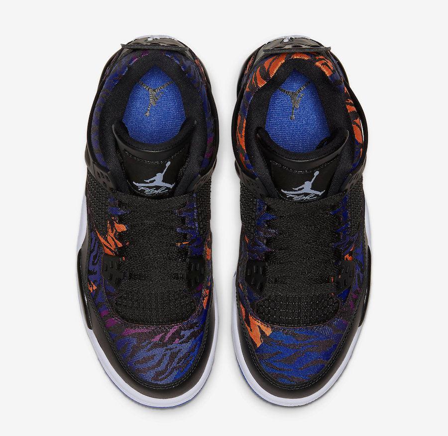 Dressed in a Black, White, Rush Violet, and Racer Blue color scheme. This Air Jordan 4 features a tiger-striped canvas upper in a mix of Blue, Purple, and Orange hues. A White Jumpman on the Black leather tongues and heels atop a matching White midsole and Blue rubber outsole completes the design.