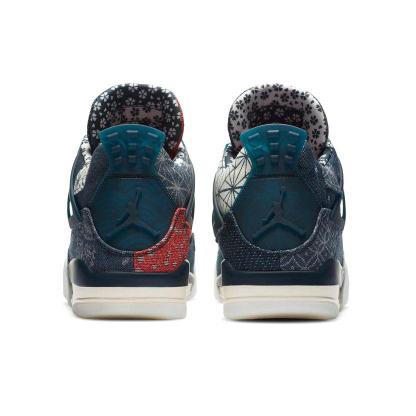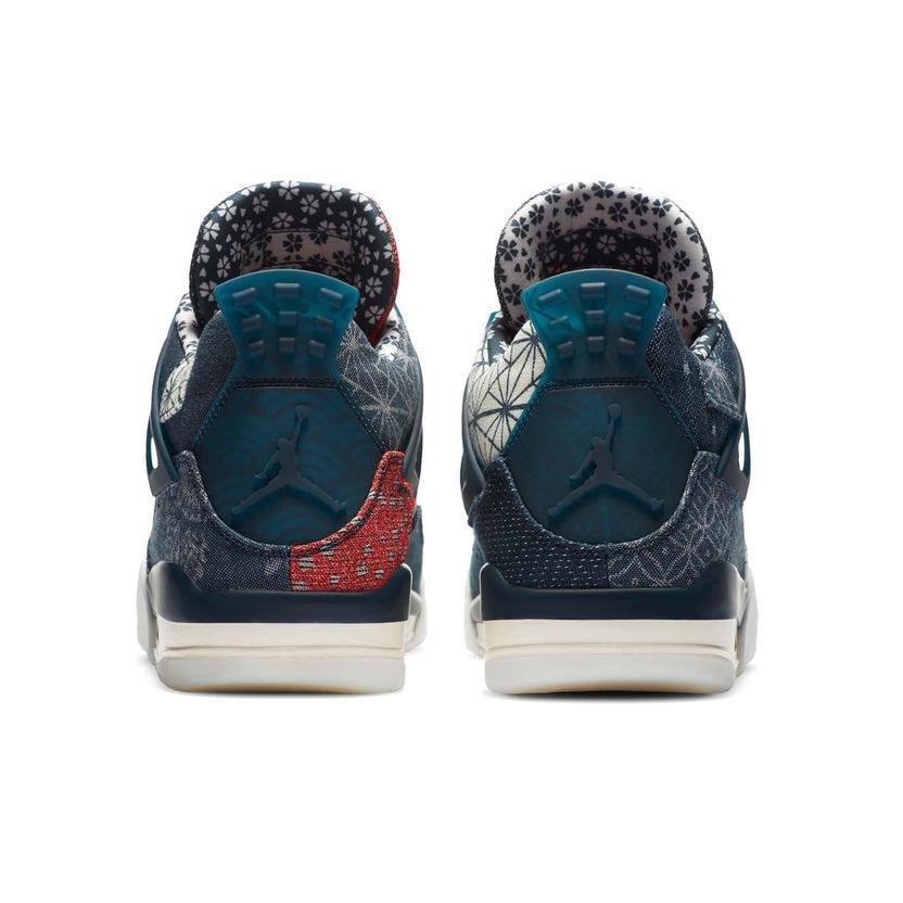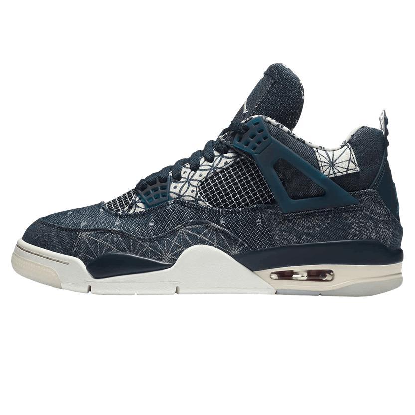 Inspired by "Sashiko" stitch art , this new Air Jordan 4 features an indigo blue and white patchwork design . Indeed, each canvas yoke is embellished with different patterns inspired by Japanese craftsmanship . Other finishes include semi-translucent TPU inserts , a few touches of red , branding on the tongue and heel, as well as a sole equipped with a visible Air-Sole unit under the heel.